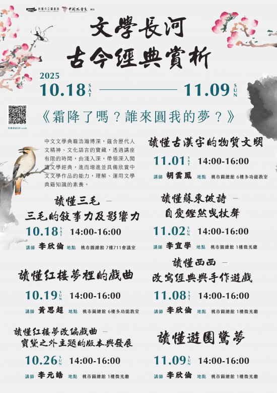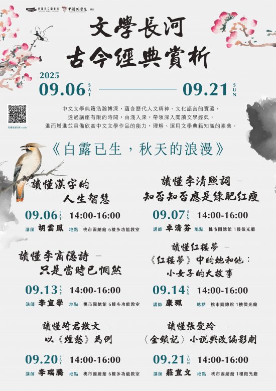 一、 | 為推廣文學之美,本館特邀國立中央大學中國文學系學者,共同舉辦「文學長河 古今經典賞析」系列講座。 |