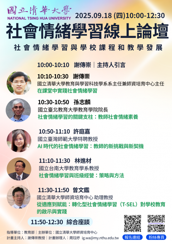 | 二、 | 查旨揭論壇聚焦SEL於課堂實踐、教師素養培養、AI時代挑戰、班級經營及T-SEL應用等,透過專家講座與實務交流,探討SEL如何融入課程與教學,促進師生關係與學生發展,辦理相關資訊如下: |