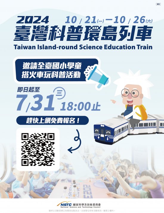 三、 | 國科會「2024年臺灣科普環島列車」活動,訂於113年10月21日至26日舉辦,列車將行經全臺各縣市28個火車站點,為使各縣市國小師生能有參與機會,今(113)年採公開報名方式受理「全國各縣市國民小學」線上報名登記,歡迎貴校教師及代表人員登記(以43人為原則),活動報名截止日期為113年7月31日18時止,相關活動最新訊息請至網站(https://apply.nstctrain.tw)查詢,檢附活動說明1份。 |