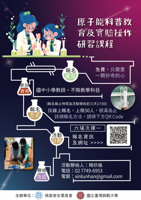 主旨: | 轉知國立臺灣師範大學化學系和核能安全委員會合作辦理之114年「原子能科普教育及實驗操作」研習課程一案,詳如說明,請查照。 |