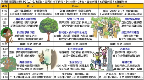 | 一、 | 2026生態素養冬令營日期1/24~2/12,招生一-九年級學員,依不同課程分齡參加,詳細請見營隊課程網站 https://www.i3nature.com.tw/ 。 |