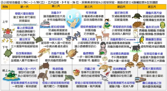 | 二、 | 課程主題:①蘭陽山野求生營(5天4夜)、②小琉球海龜營(5天4夜)、③宜蘭生態農場營(3天2夜)、④TPE博物館生態營(3天外出不過夜)、⑤屏東柚園攀樹營(3天外出不過夜)、⑥節肢小怪獸營(3天大學不過夜)、⑦池上單車生態營(4天3夜)。 |