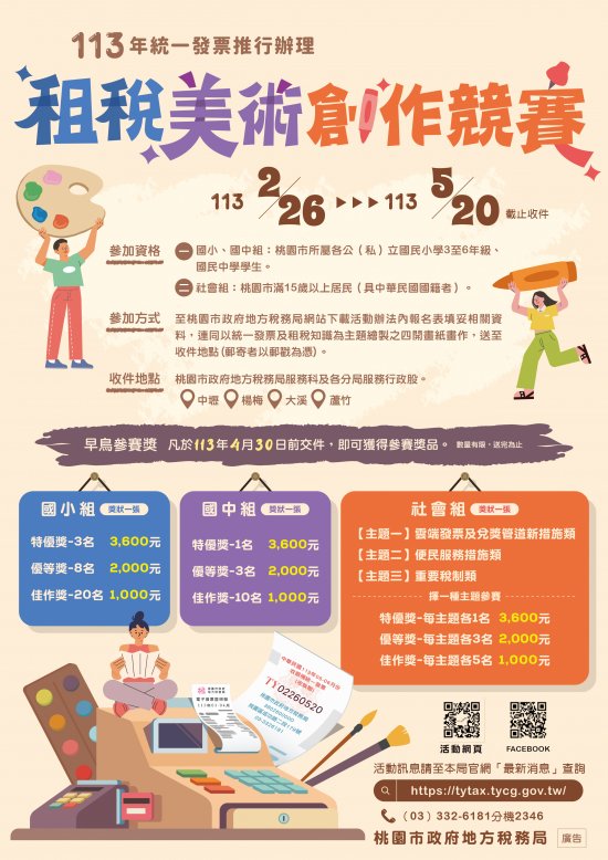 (一) | 畫作繪製內容:參賽者將統一發票兌獎管道新措施(含統一發票兌獎App)、購物消費索取統一發票、行動支付結合雲端發票、雲端發票自動化對獎、利用社會福利團體捐贈碼捐贈雲端發票、地方稅3大稅(房屋稅、使用牌照稅、地價稅)開徵訊息、國稅及地方稅種類、便民服務措施、多元化繳稅管道、稅收建設、重要稅制及稅政等為主題自訂題目,以繪畫方式呈現。 |