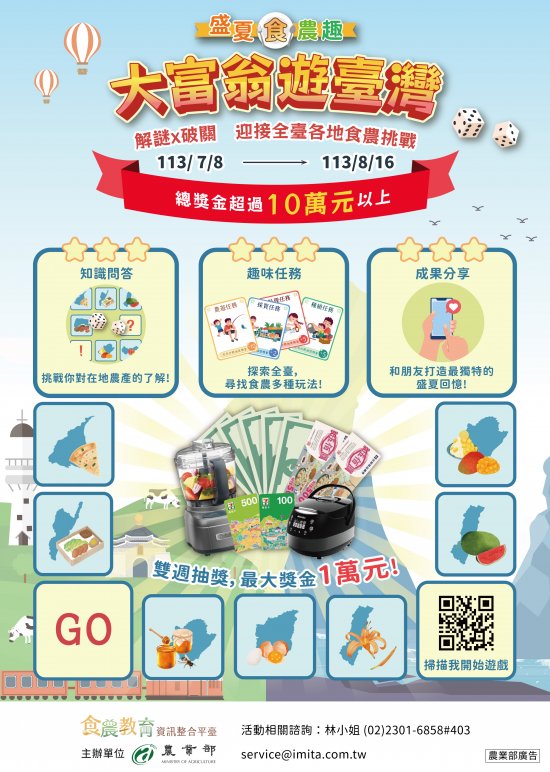 三、 | 為強化食農教育素養,並促使大眾更加瞭解食農教育,農業部應用該平臺內容,訂於113年7月8日至8月16日舉辦「盛夏食農趣:大富翁遊臺灣」食農教育推廣活動(網址:https://fae.moa.gov.tw/2024event/),提供食農教育相關知識問答、任務體驗與成果分享等遊戲,參與活動即可抽獎,總獎金超過10萬元,歡迎踴躍參與。 |