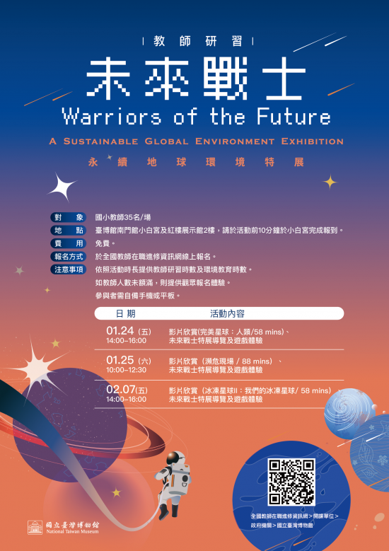 | 三、 | 該館訂於114年1月24日(星期五)、1月25日(星期六)及2月7日(星期五)假南門館(臺北市中正區南昌路一段1號)辦理三梯次教師研習課程,參與研習之教師,將依課程時長核發研習及環境教育時數。 |