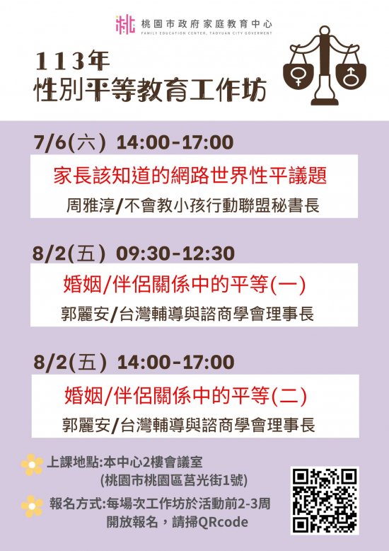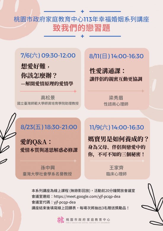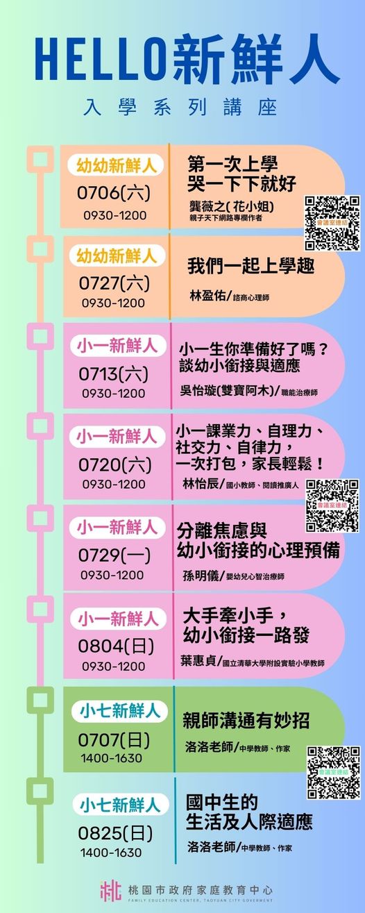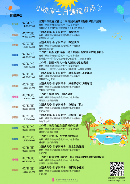 檢送家庭教育中心中心「小桃家7月課程資訊」、「Hello!新鮮人系 列講座」、「幸福婚姻系列講座」、「性別平等教育工作 坊」及「預約幸福生活婚前教育工作坊」海報各1份